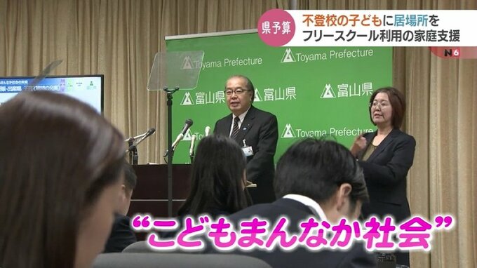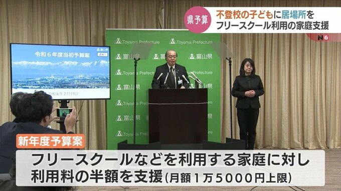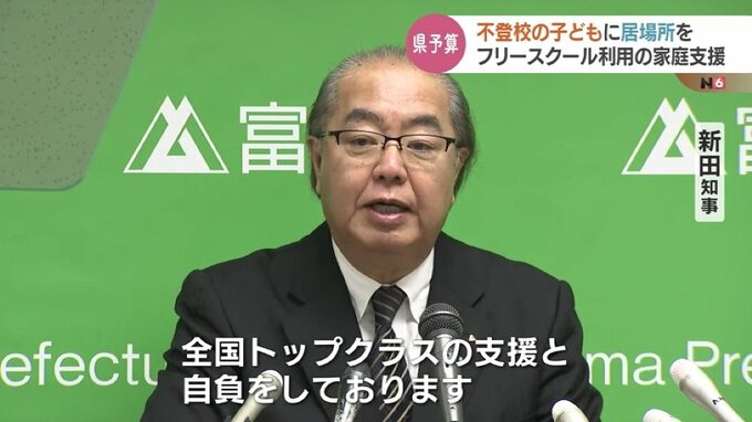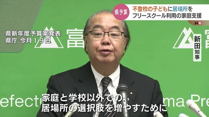 富山県 新田知事:「家庭と学校以外での居場所の選択肢を増やすために、フリースクールなどの利用料などを助成します。月額1万5000円上限ですが、全国トップクラスの支援と自負しています。また世帯の所得要件を設けていないのは他県では例がありません」