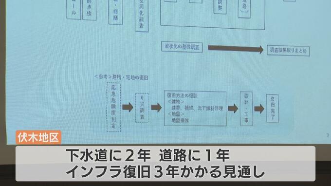 市側は、インフラ復旧のスケジュールを示し、下水道の復旧に2年、その後は道路工事に1年、合わせて3年かかる見通しであると説明しました。