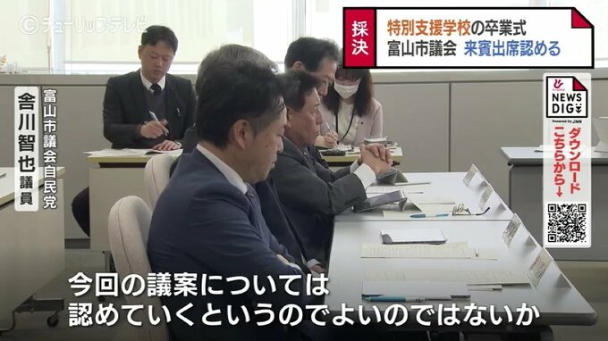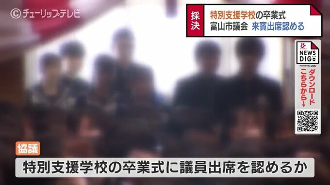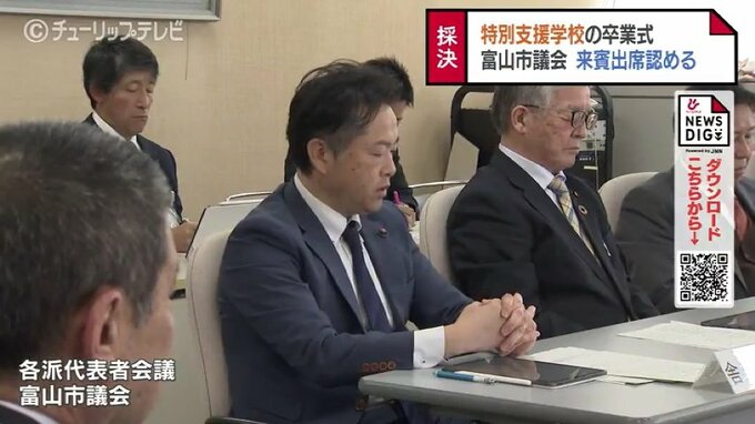 最大会派の富山市議会自民党が賛成した一方、立憲民主、公明の会派が反対に回りましたが、採決の結果、賛成多数で特別支援学校の卒業式に来賓としての出席を認めることが決まりました。