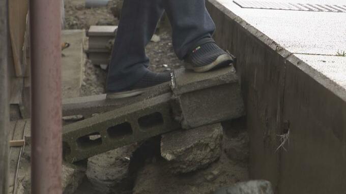 こちらの住宅は道路と建物との間に、最大70センチの段差ができ、今も車を出すことができません。