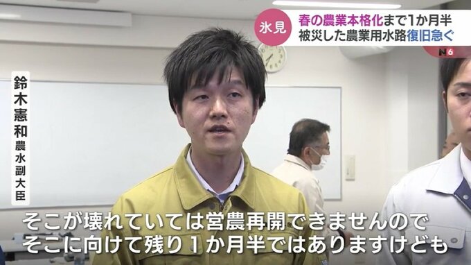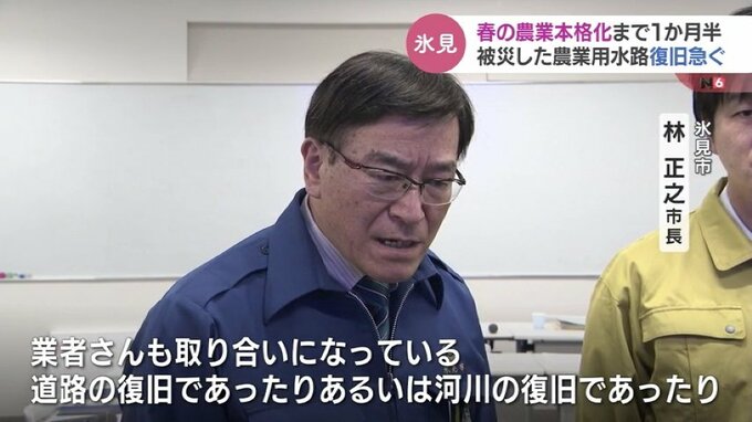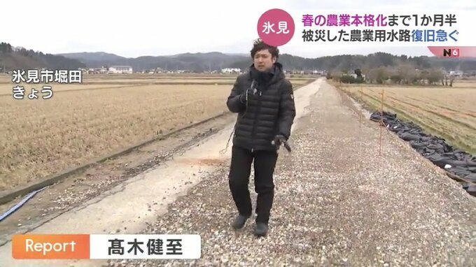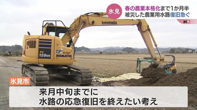 氷見市では農作業が本格化する4月中旬までに田んぼに水が流れるよう国や県、地域住民とも協力し応急的な復旧作業を終えたい考えです。