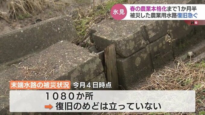 氷見市によりますと幹線水路などについては4月中旬までに応急的な復旧作業を終える見込みですが、末端の水路1080か所については被害の全容がわからず、いまも復旧のめどはたっていません。