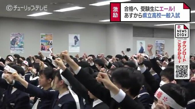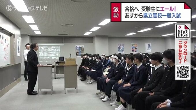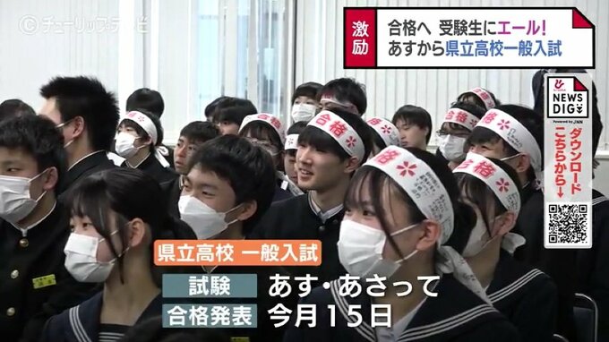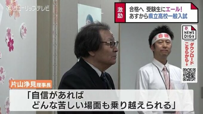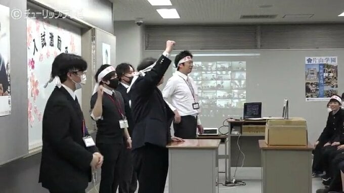 本番を前に6日、富山育英センターでの激励会、片山浄見理事長が受験生とおそろいの「合格」とかかれたハチマキをつけ「自信があればどんな苦しい場面も乗り越えられる」と受験生にエール。