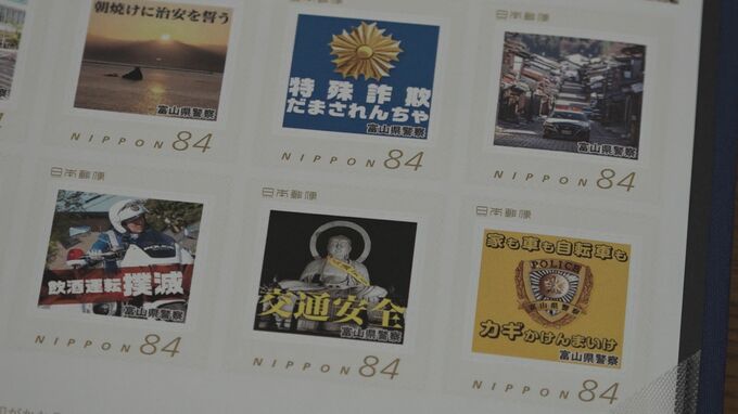 富山の名所を背景に、防犯や交通安全などを呼びかける富山県警オリジナルフレーム切手が、限定販売されます。
