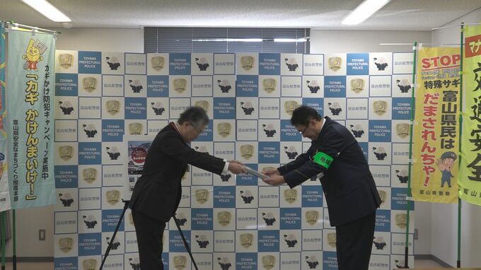 県内在住の写真家イナガキヤストさんが撮影した立山連峰を背景に走るパトカーや、交通安全のタスキをかけた高岡大仏など、富山ならではの84円切手10種類が7日、県警でお披露目されました。
