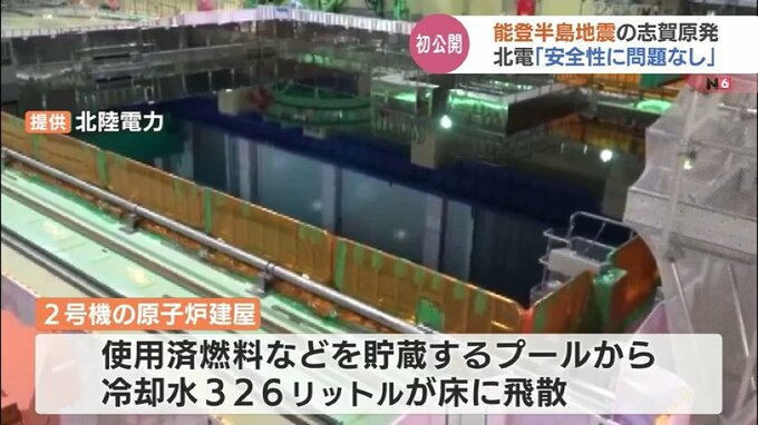 志賀原発2号機の原子炉建屋では当時、使用済燃料などを貯蔵するプールから冷却水326リットルが床に飛散しましたが、北陸電力は「外部に漏れ出していないことから安全性に問題がない」としています。