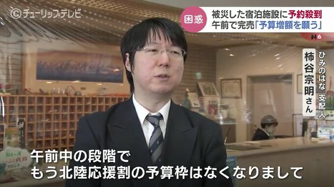 ひみのはな支配人 柿谷宗明さん:「午前の段階で北陸応援割の予算枠がなくなりまして。あとは大変心苦しいんですけど、割引なしの料金で宿泊していただくしかないような状況になっています」「できればすべてのお客様に割引で利用していただきたいと思いますので、ぜひ予算の増額の方を、またならないかなと願っているところなんですけど…」