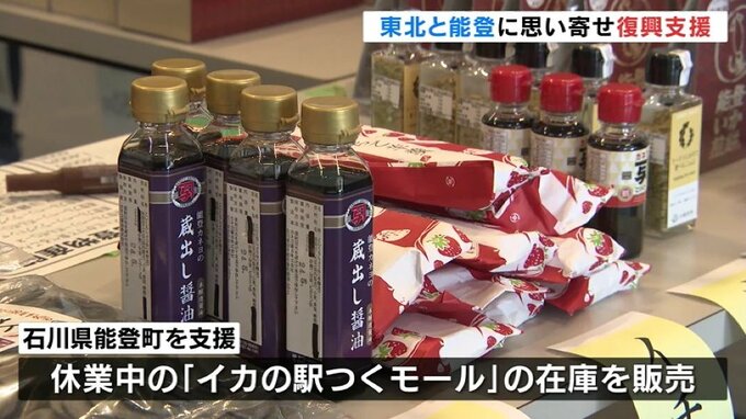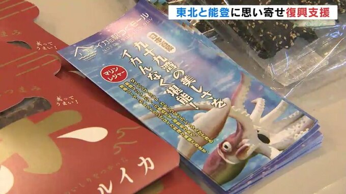 今回のイベントでは、元日に発生した能登半島地震も支援したいと石川県能登町(のとちょう)の「イカの駅つくモール」から水産加工品やお菓子などの在庫を買い取り販売しています。