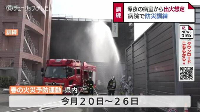 春の火災予防運動を前に11日、富山市内にある済生会富山病院では高層建物の火災を想定した訓練が行われました。