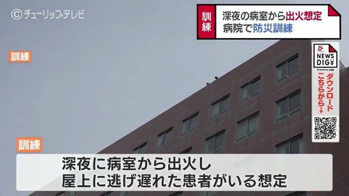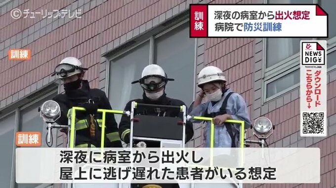 訓練は深夜に病室から出火し、屋上に逃げ遅れた患者がいるとの想定で行われました。