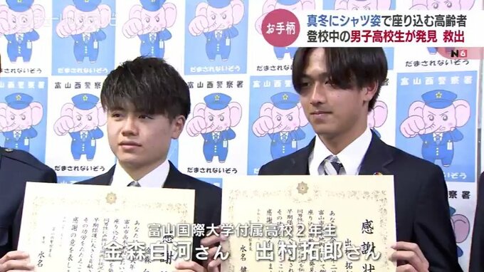 側溝に高齢者がシャツ1枚で…真冬の朝に高校生2人の勇気ある行動 高齢者を救う 富山 2024年3月20日(水) 08:00 国内 冷え込みが厳しかった2月の寒い朝、人目がつかない側溝の上に座り込んでいたシャツ一枚の高齢者を男子高校生が見つけ、高齢者は一命をとりとめました。富山警察から感謝状が贈られたのは富山国際大学付属高校2年生…