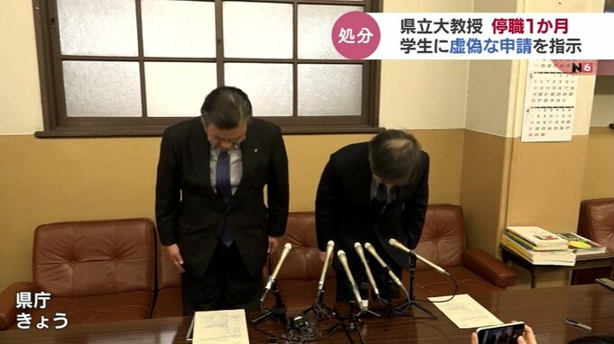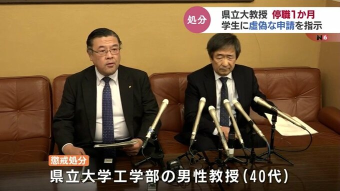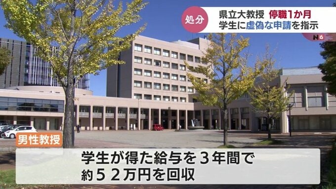 大学によりますと、40代の男性教授は、学内の研究作業名目で虚偽のアルバイト出勤簿を作成するよう指示。学生が得た給与を2019年度からの3年間でおよそ52万円回収し、教授と学生が参加する県外での学会への旅費に充てていたということです。