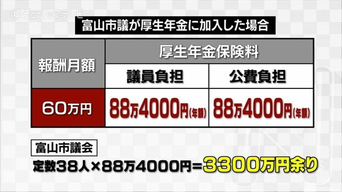 月額報酬60万円の富山市議では市の負担額が年間で88万4000円に上り、全体の負担額は定数38人で年間3300万円余りとなる計算です。
