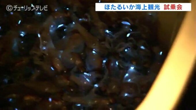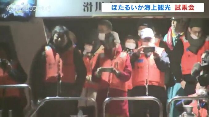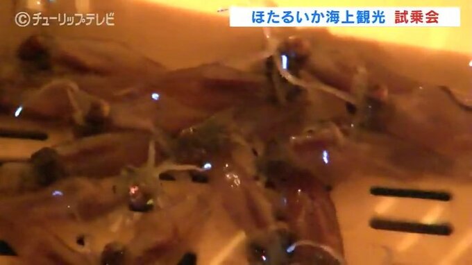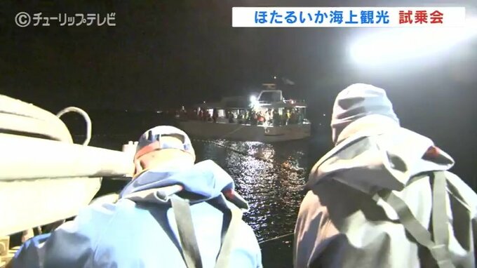 富山県滑川市のホタルイカの定置網漁を間近で見学できる観光船が3月30日から運航を開始するのを前に23日、試乗会が行われました。