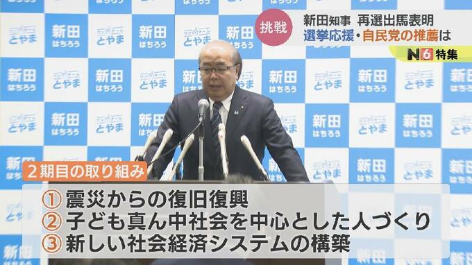 3月22日、秋の知事選に再選出馬することを表明した新田知事。1期目の成果としては、県内の全15市町村長と知事が議論する「ワンチームとやま連携推進本部会議」の設置や「県成長戦略」の策定をあげました。