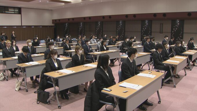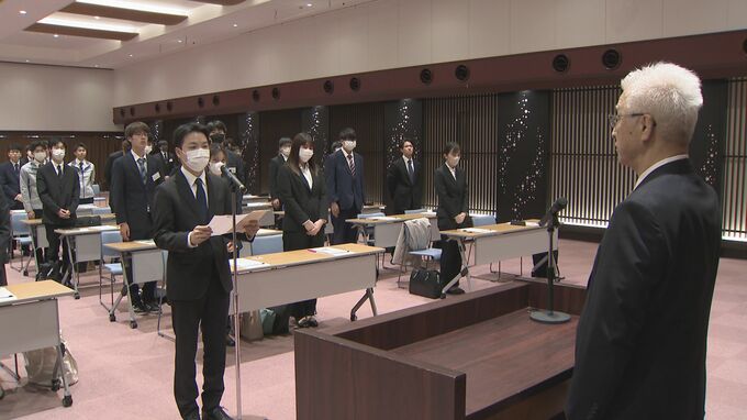 これは高岡商工会議所が会員企業などの新入社員を対象に毎年実施しているものでことしは、市内の企業29社から53人が参加しました。式では参加者を代表してオフィス総合商社の山辺事務機に入社する高井涼さんが「きょうの感激をいつまでも忘れることなく若さとチャレンジ精神を持って邁進します」と、決意を述べました。