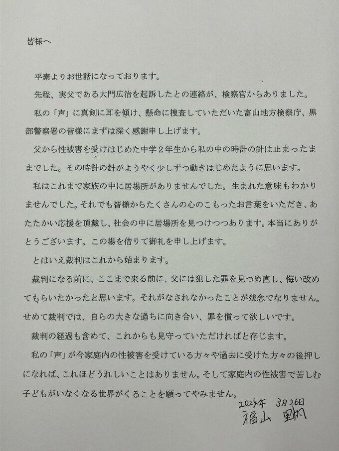 私の「声」が今家庭内の性被害を受けている方々や過去に受けた方々の後押しになれば、これほどうれしいことはありません。そして家庭内の性被害で苦しむ子どもがいなくなる世界がくることを願ってやみません。