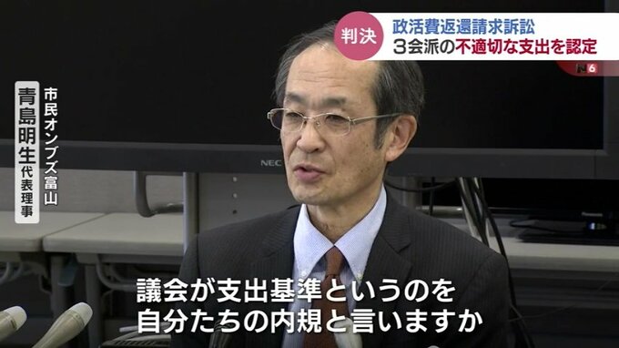 市民オンブズ富山 青島明生代表理事:「議会が支出基準というのを自分たちの内規と言いますか自分たちの基準として作っているんですが、それが甘すぎる。結局認められるものは一部しかなかった。会派の裁量を認めるという裁判所の判断ということで、裁判所の限界ということが明らかとなった」