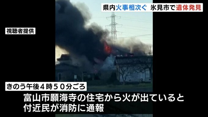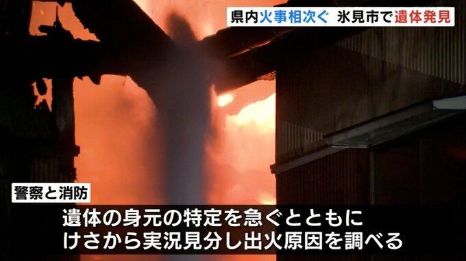 きのう、県内では火災が相次ぎました。富山市では1人が行方不明となっているほか氷見市では焼け跡から身元不明の遺体が見つかっています。