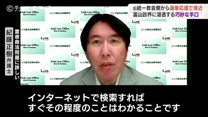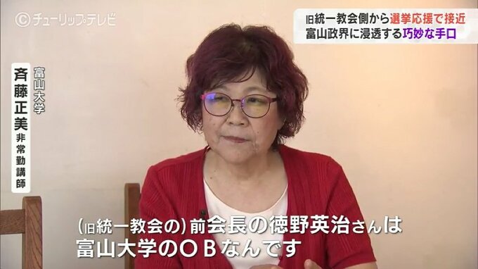「(旧統一教会の)前会長の徳野英治さんは富山大学のOBなんです。このあたりがいろいろズブズブなのは、要職についた統一教会の幹部の人が何人もいる、出身者もいるということ」