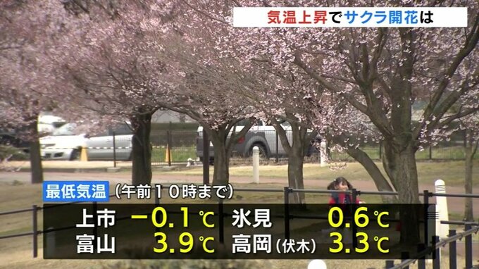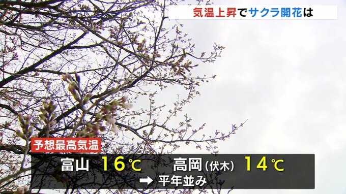 このあとの県内はときおり晴れ間が除く予想で日中の予想最高気温は富山で16℃高岡の伏木で14℃と平年並みまで上がる見込みです。富山地方気象台によりますとソメイヨシノの開花宣言はまだ出ていませんが気温の上がり具合や日差しによっては宣言を出す可能性もあるということです。