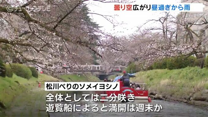 松川遊覧船によりますと、木によってばらつきがあるものの全体としてサクラは二分咲きで、週末には満開を迎えるのではないかということです。