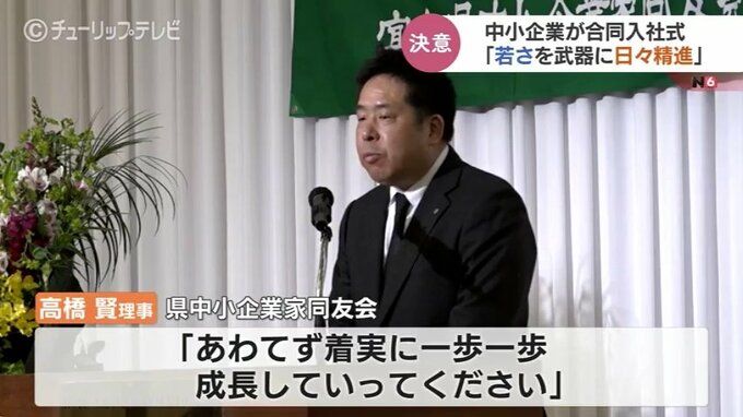 式では高橋賢理事が「慌てず着実に一歩一歩成長していってください」と激励の言葉を送ると、射水市の美容機器販売業・モリタの北川斎弥さんが新入社員を代表して決意を述べました。