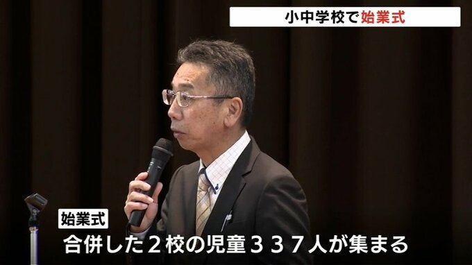 始業式では新築の体育館に合併した2校の児童337人が集まり、覚えたての新しい校歌を体育館に貼られた歌詞を確認しながら元気よく歌っていました。