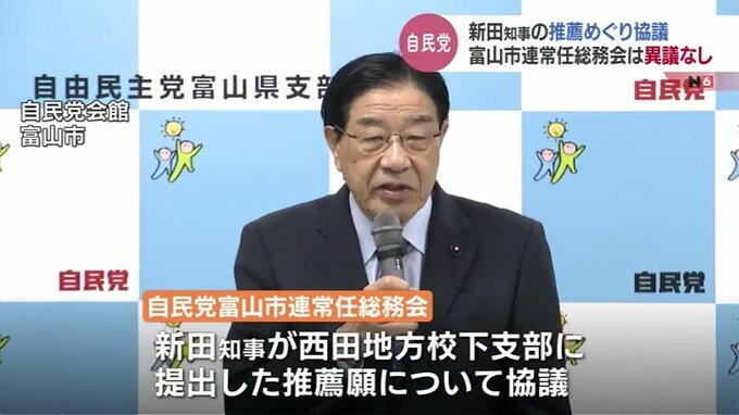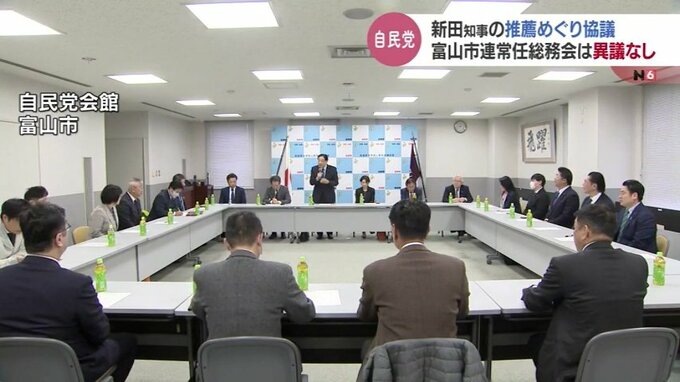秋の富山県知事選挙での推薦をめぐり、自民党富山市連は4日、常任総務会を開き新田知事への推薦について満場一致で異議なしとしました。