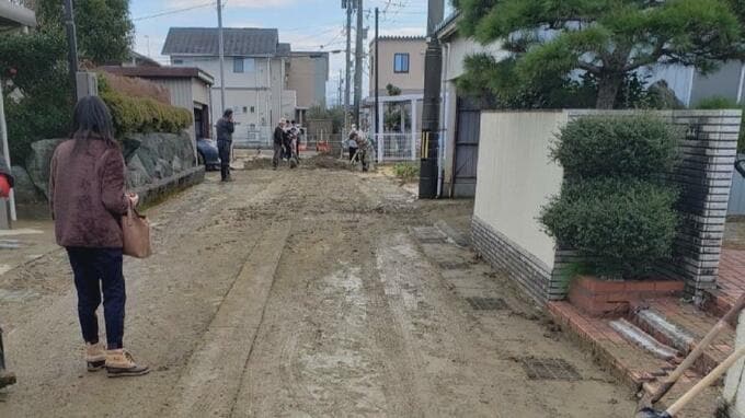 地震で地面に入った亀裂から泥水が溢れて出ています。まちは一瞬にして、泥だらけになりました。