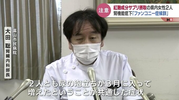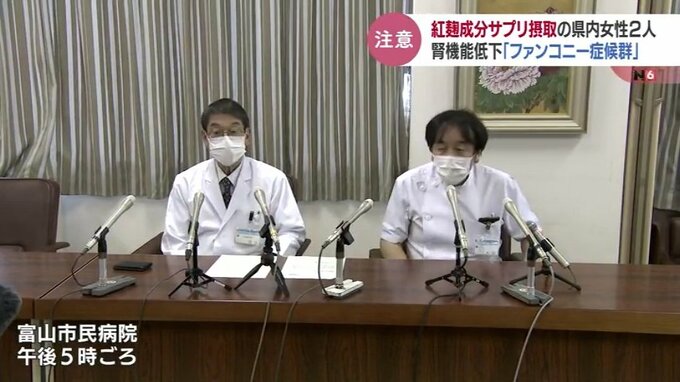 小林製薬の「紅麹」成分を含むサプリメントを飲んでいた人に健康被害が出ている問題で、サプリを飲んでいた富山内の女性2人が、腎臓の機能が低下する「ファンコニー症候群」の疑いがあると診断されていました。