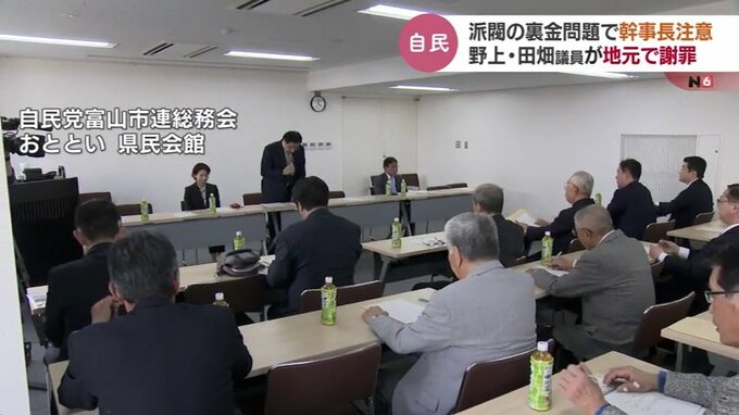 6日、自民党富山市連の総務会に富山県選出の野上議員と田畑議員が出席し、地元の党員を前にお詫びし、政治の信頼回復を誓いました。