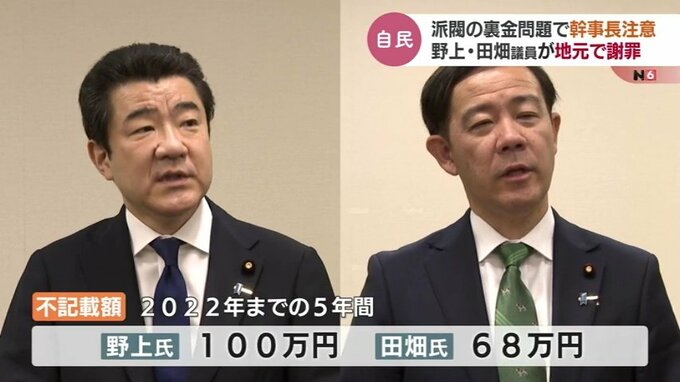 野上議員・田畑議員はともに安倍派で不記載額は野上氏が100万円、田畑氏が68万円です。
