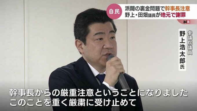 野上浩太郎 参議院議員議員:「幹事長からの厳重注意ということになりました。このことを重く厳粛に受け止めて、政治の信頼回復に向けて真摯に取組みを進めて参りたいと思います」