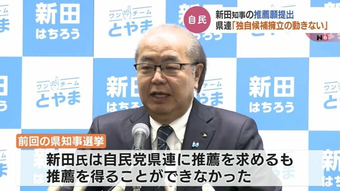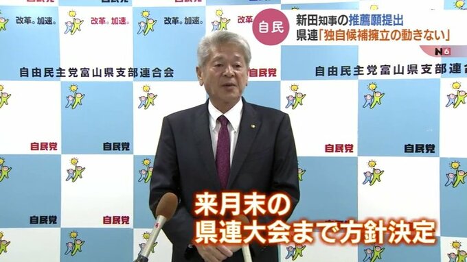 一方、ことし秋に行われる富山県知事選をめぐって、現職の新田八朗氏の推薦願が8日、自民党富山市連から県連に提出されました。県連は5月末の県連大会までに方針を決定します。