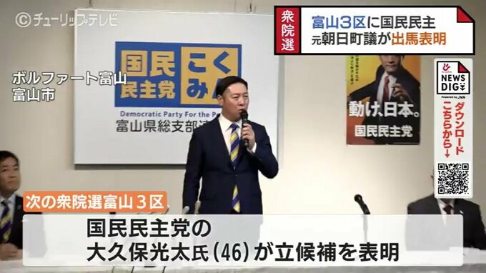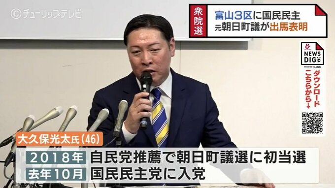 次の衆院選富山3区に元朝日町議会議員で国民民主党の大久保光太氏(46)が8日、出馬すること表明しました。