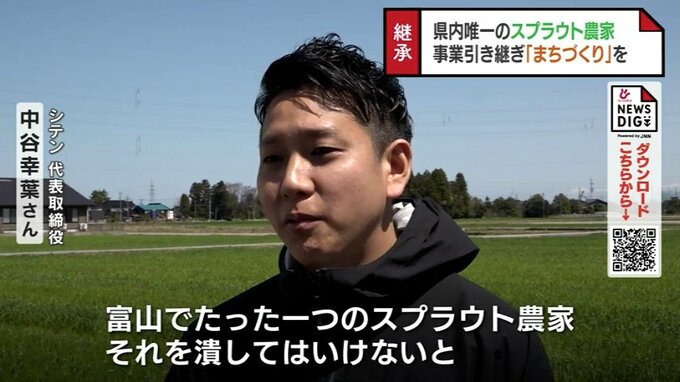 シテン代表取締役 中谷幸葉さん「富山でたった一つのスプラウト農家、それを潰してはいけないと、引き継がないといけないと、そう思いました。スプラウトという意味自体、新芽なんですけど、スプラウトの街というものを目指し、一つ一つの目を咲かせて、大きくしていく、そういった若い人がイキイキとした街づくりをしたいと思ってます。」