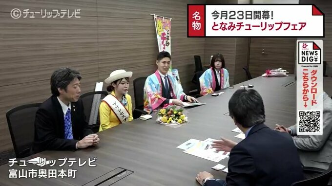今月23日から始まる「となみチューリップフェア」は、ことしも「大花壇の地上絵」や高さ4メートル、長さ30メートルの「花の大谷」など見どころが満載です。開幕を前にプリンセスチューリップらがチューリップテレビを訪れフェアをPRしました。