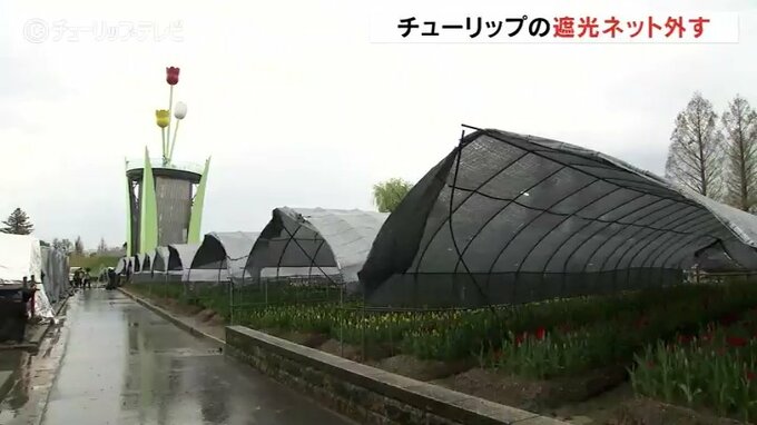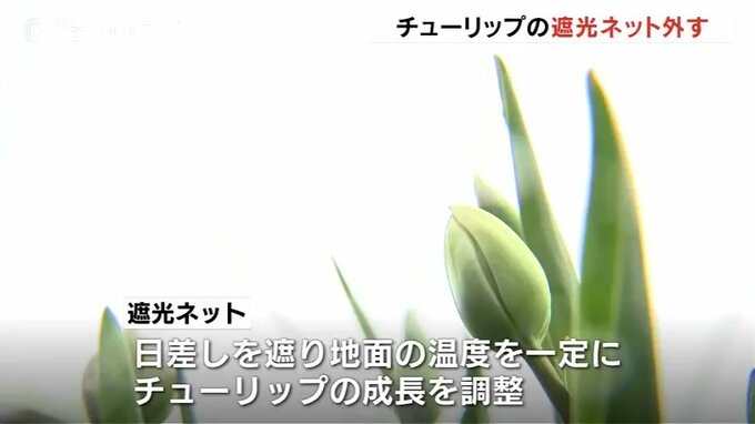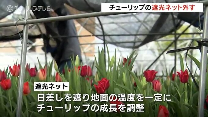 遮光ネットは冬の間の日差しを遮り、地面の温度を一定に保つことでチューリップの成長を調整するもので、16日から3日間かけて撤去作業が行われます。