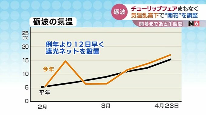 300品種、300万本のチューリップが咲き誇るチューリップフェア。実は期間に合わせて満開となるよう気を遣うのが、遮光ネットによる花の開花調整…。今年は開幕日に5割の開花を目指しています。