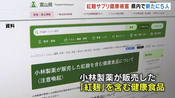 小林製薬の「紅麹」成分を含むサプリメントを飲んでいた人に健康被害が出ている問題で、富山県内で被害を訴えている人は、16日までに新たに5人増え11人となりました。