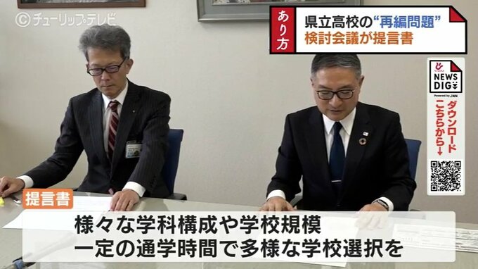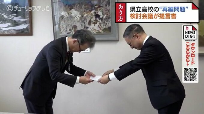 富山県内の教育関係者などでつくる県立高校教育振興検討会議が18日、県立高校の再編についての提言書を県の廣島教育長に手渡しました。