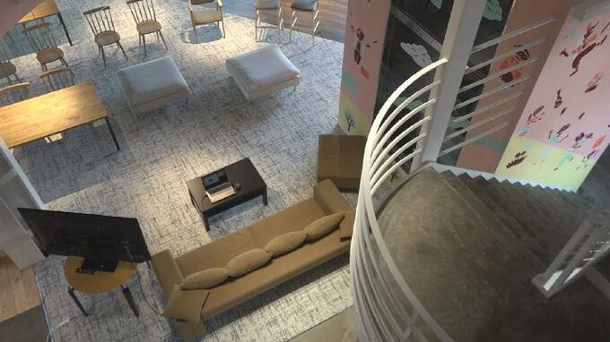 施設には宿泊スペースのほかカフェやワーキングスペースなどが設置されています。