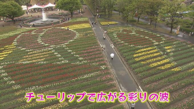 今年のテーマは「チューリップで広がる彩りの波」。大花壇の地上絵ではテーマにちなんでチューリップによって生まれる笑顔や癒しが広がっていく様子が表現されています。