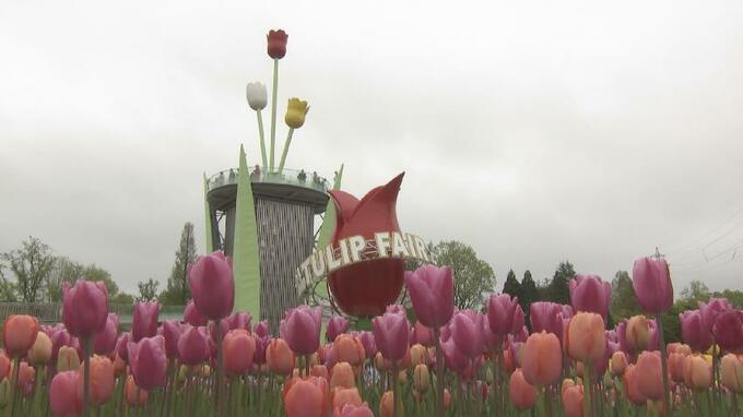 記者:「公園が一望できるタワーの上に来ています。大花壇にはチューリップの地上絵が広がっています」