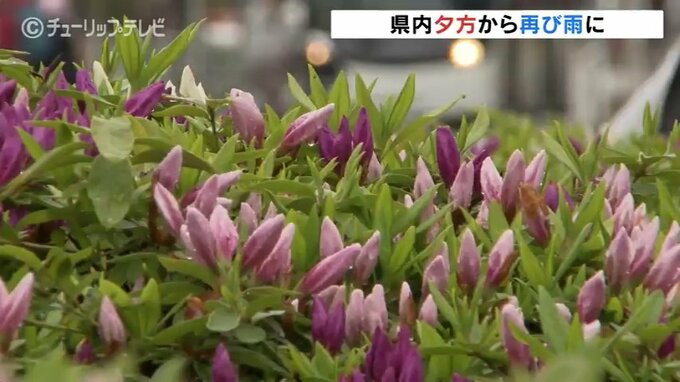 富山駅前では白や紫のツツジが雨の中しっとりと咲き始めていました。