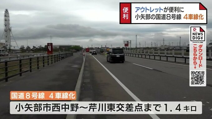4車線化したのは国道8号の小矢部市西中野から芹川(東)交差点の間、およそ1.4キロです。以前は2車線でしたが、渋滞緩和や追突事故の防止を目的に国土交通省富山河川国道事務所が2014年から工事を行っていました。