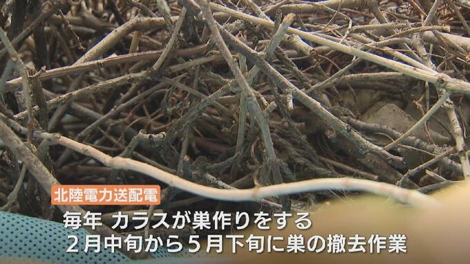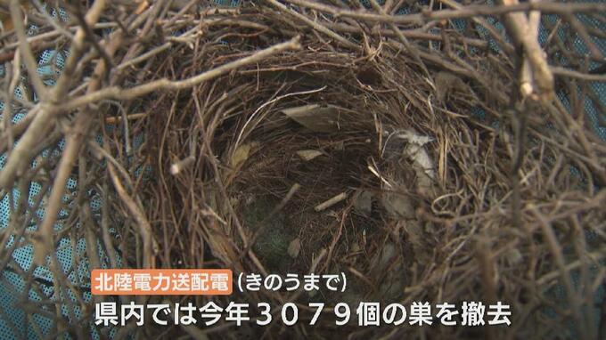 北陸電力送配電は、毎年カラスが巣作りをする2月中旬から5月下旬に巣の撤去作業を行っていて県内では今年は3079個の巣が撤去されました。