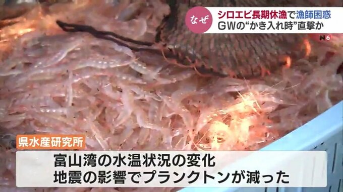 専門家は現時点で不漁の理由は特定できないとしながらも、シロエビが生育する富山湾の水温状況の変化や地震の影響でエサとなるプランクトンが減った可能性があるとしています。