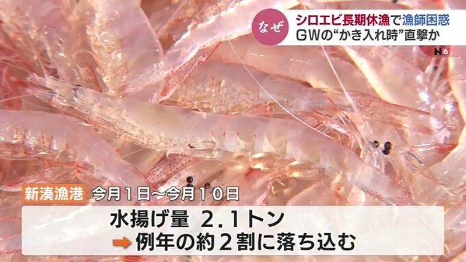 4月1日に解禁となった富山湾のシロエビ漁の不漁が続いています。射水市の新湊漁港では4月10日までの水揚げ漁が例年のわずか2割と大型連休が明ける5月9日までの休漁を余儀なくされています。